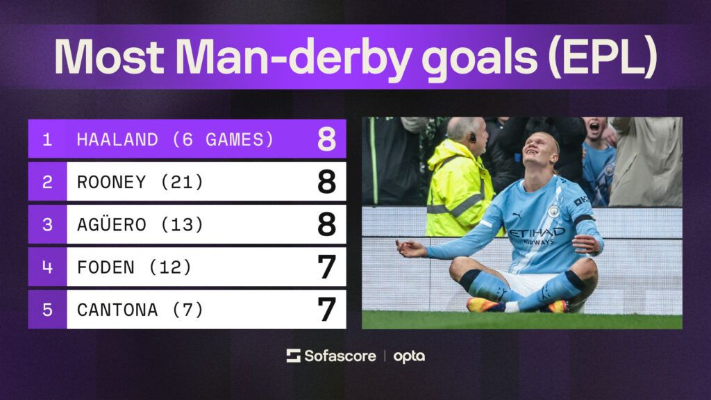 On the blue side of Manchester, the derby only strengthened Erling Haaland’s case as one of the most ruthless strikers in history. He has now scored eight goals in just six Premier League derbies against United, matching the numbers of Wayne Rooney and Sergio Agüero in far fewer games.