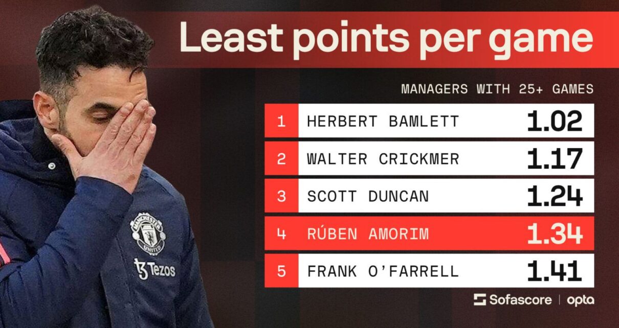 Rúben Amorim is now statistically one of the least successful managers in United’s modern history. With just 1.34 points per game, he holds the worst record for any United boss with 25+ games since the 1940s. In the Premier League era, he ranks 137th out of 177 managers.